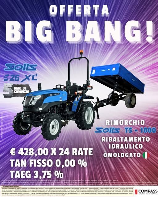 PROMO TRATTORE SOLIS S26XL + CON RIMORCHIO OMOLOGATO ITALIA TS-1000